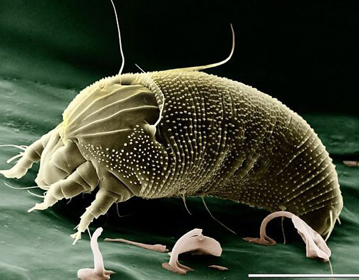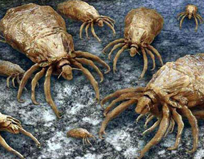 Os ácaros são artrópodes pertencentes a classe Arachnida, mesmo grupo das aranhas, carrapatos e escorpiões. São seres de tamanho muito pequeno, invisíveis a olho nu, na maioria das vezes. São responsáveis por respostas alérgicas, tais como: rinites alérgicas, asma e eczemas. Estão associados a ambientes quentes e úmidos, ideais para sua proliferação.